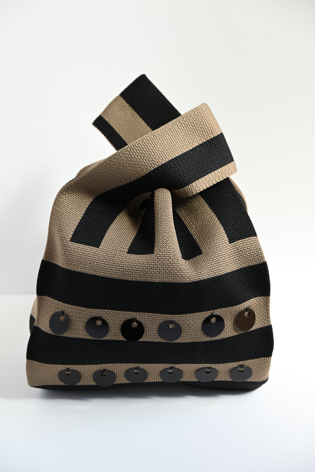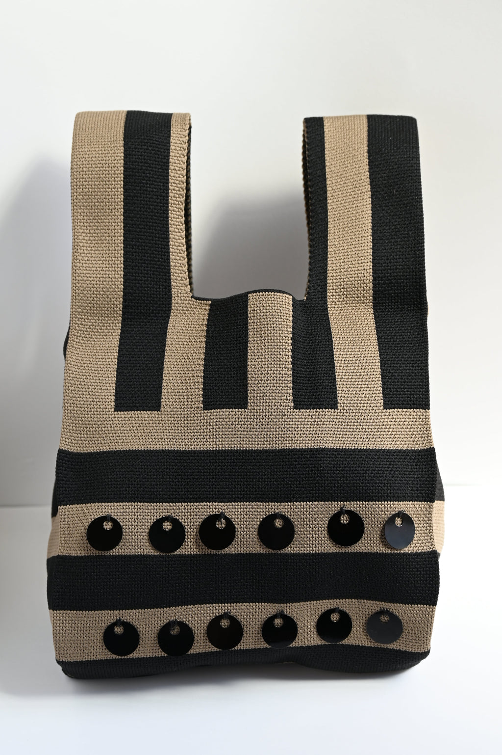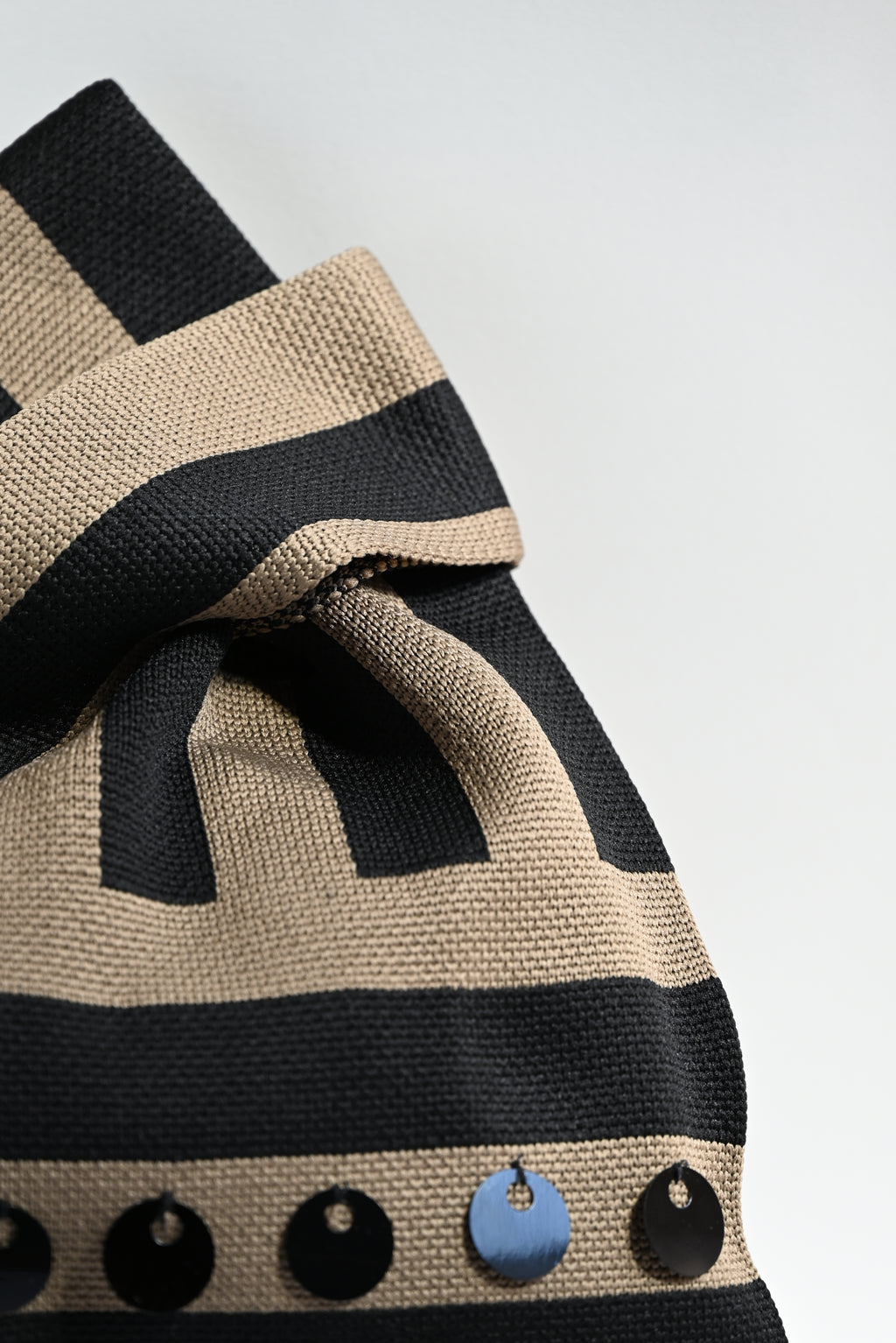 Le righe in nero e beige, arricchite da paillettes cucite a mano, creano un contrasto sobrio ma d’impatto, che si adatta perfettamente a look sia casual che più curati.