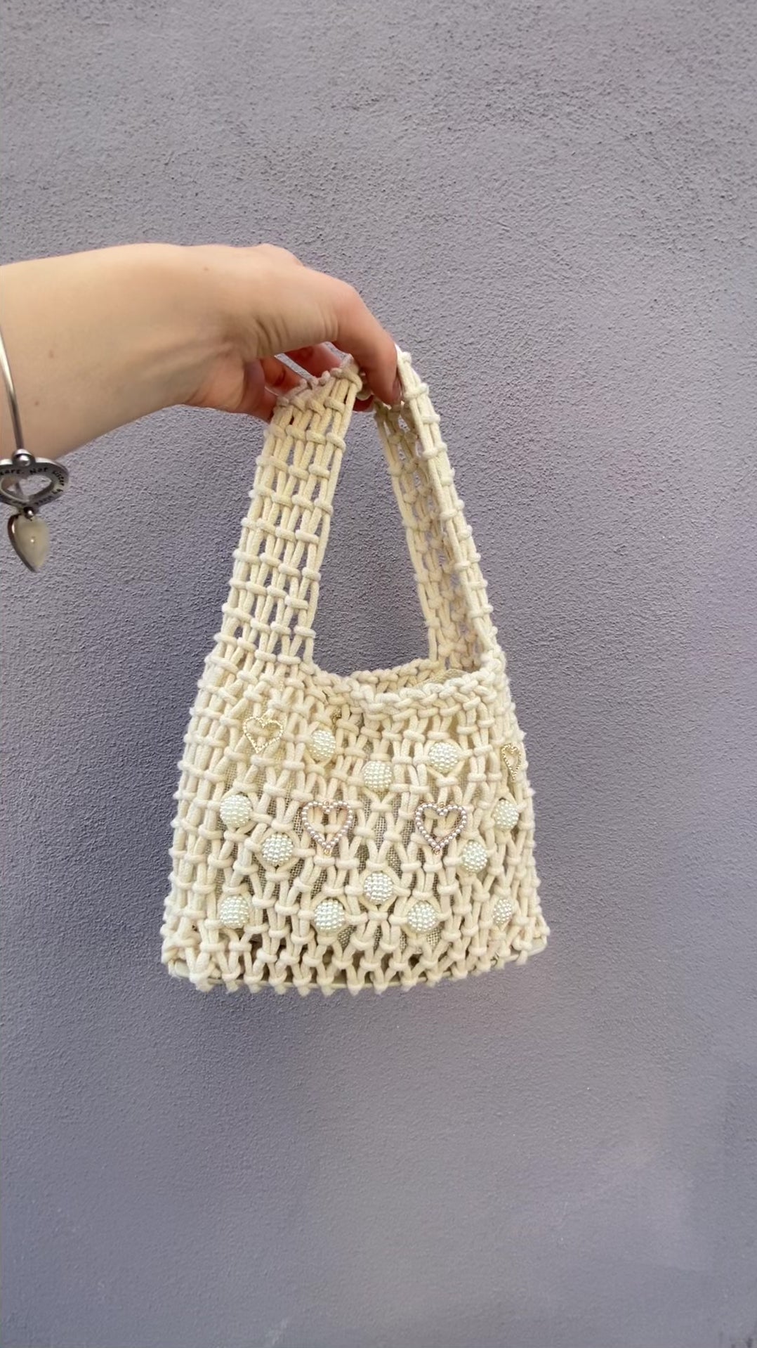 White Wave è interamente decorata a mano con perline e piccoli charm cuciti uno ad uno, rendondola unica e irripetibile.